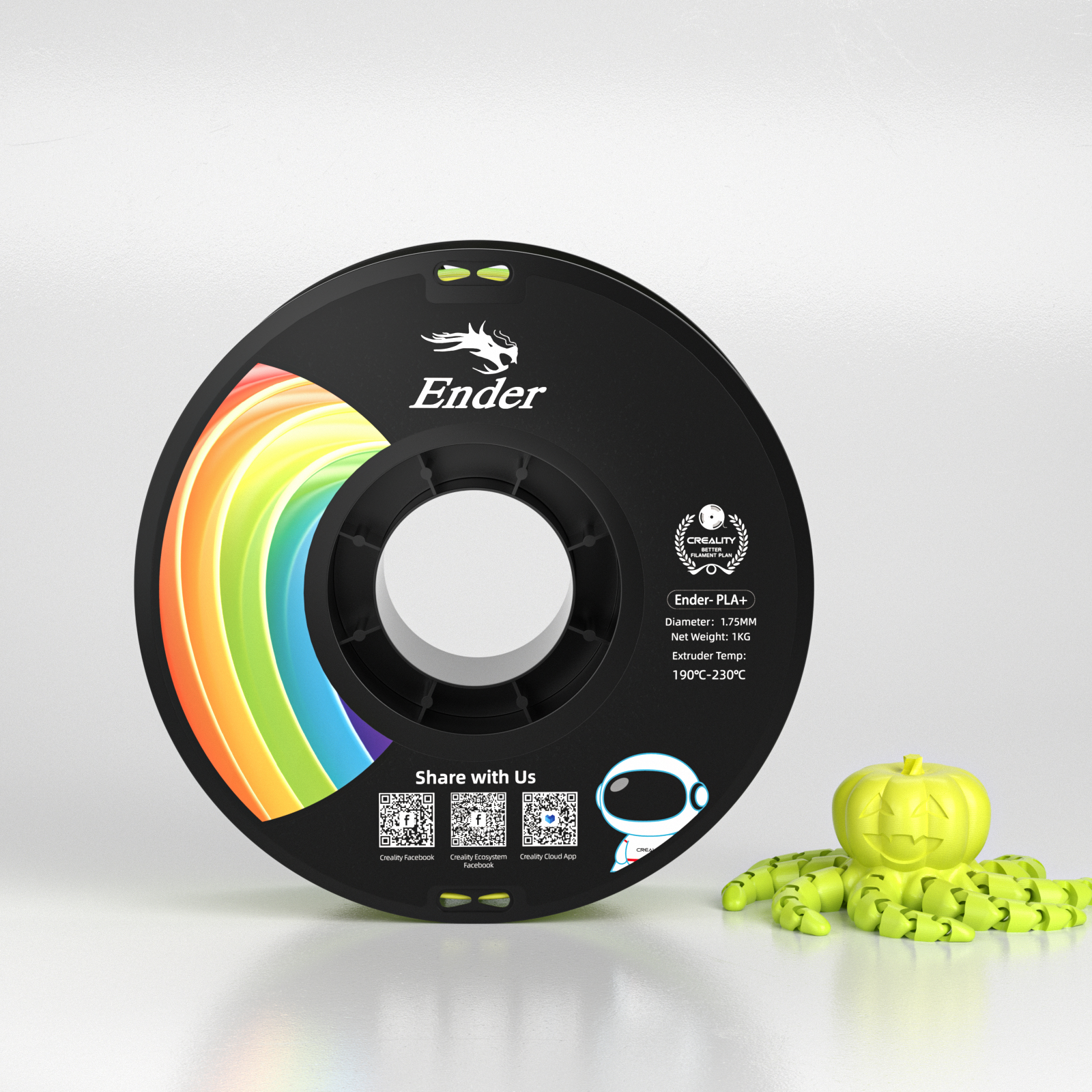 Ender PLA+ Rainbow combines the extra toughness of PLA+ with a smooth, eye-catching multi-color gradient. It prints cleanly with low warping and strong layer adhesion, making it perfect for display pieces, cosplay, gifts, trophies, desk décor, and any model that needs instant “wow”.